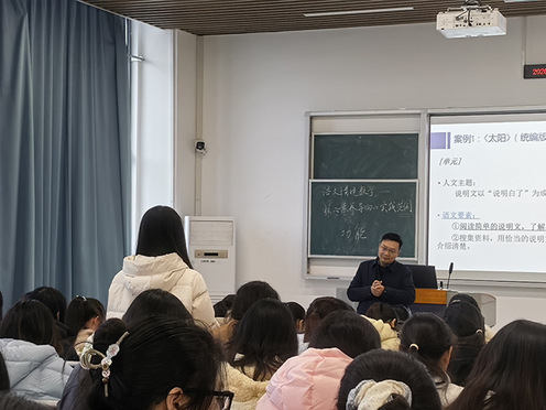 3 月 17 日上午,av影片 教授公开课暨课程思政课展示活动如期开展。陆平教授为 22 级小学教育专业 100 余名乡村小学定向生,执教示范课《语文情境教学 —— 核心素养导向的实践范例》。