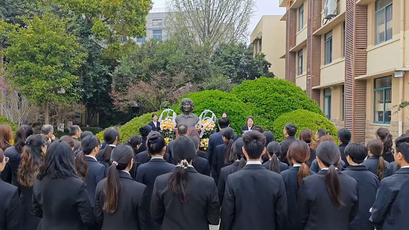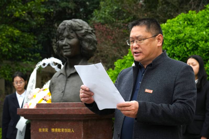 情境润心,师魂永续。活动伊始,全体肃立默哀,追思先生事迹。随后,师生代表敬献花篮,av影片 党委书记曹阳整理花篮缎带,全体师生怀着崇敬的心情向李吉林先生塑像三鞠躬,敬献鲜花。